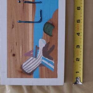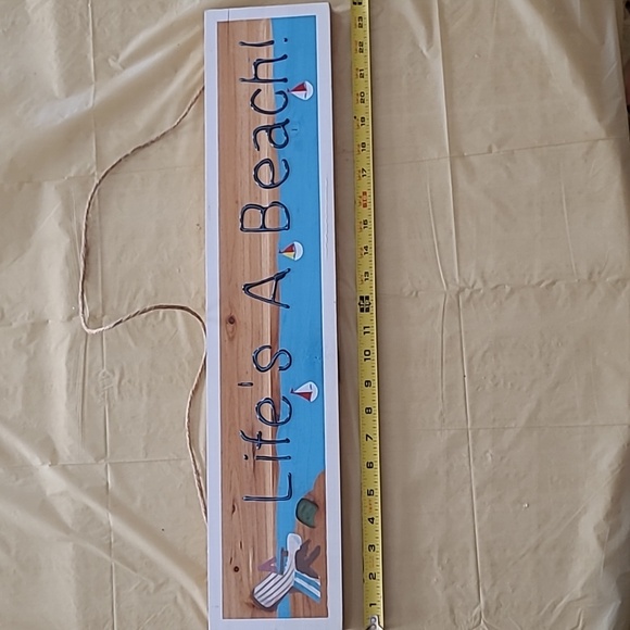 This painted wooden sign measures 4" × 24" and reads "Life's a Beach". Comes with rope for hanging.