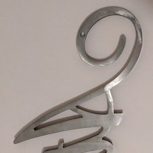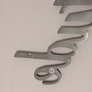 Silver iron word Attitude in cursive. Has two holes on the back for hanging purposes.