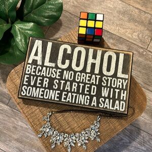 “ALCOHOL because no great story ever started with someone eating a salad” EUC - wood wall plague