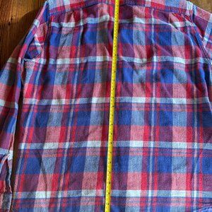 Red/White/Blue plaid size large Men's Flannel from J. Crew Wallace & Barnes in good pre-worn condition. No stains or tears, smoke free pet free home, unscented detergent.