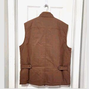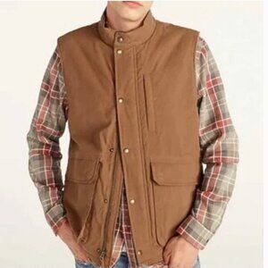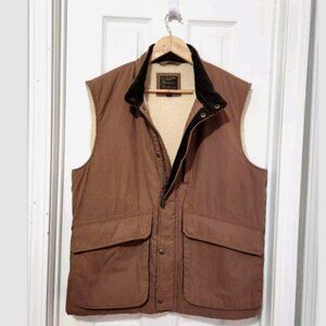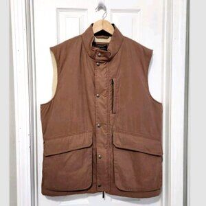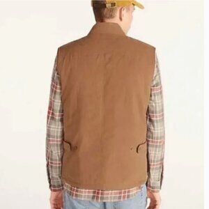 Wallace & Barnes x J. Crew Sherpa Lined Full Zip Canvas Snap Field Tan Brown Vest Full zip front with snap storm flap. Partially sherpa lined / primaloft lining.