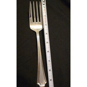 This elegant 5-piece Wallace EP silverplate serving set exudes timeless sophistication. Each piece is meticulously crafted, showcasing a gleaming finish and intricate detailing. The set includes versatile utensils such as a serving spoon, slotted spoon, sugar shell, meat fork and butter knife, all designed to elevate your table setting. Ideal for gatherings and special occasions. The sugar shell does have some dark spots, see photos.