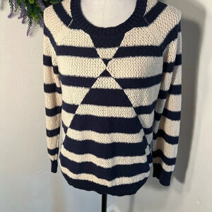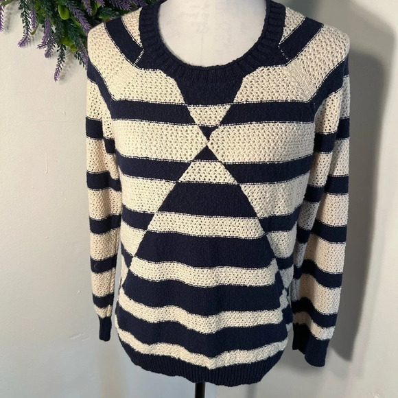 Wallace, M , Long sleeve crewneck navy blue & cream crochet knit sweater. L=24”, pit=18.5”, sleeves=25”. Material tag not found