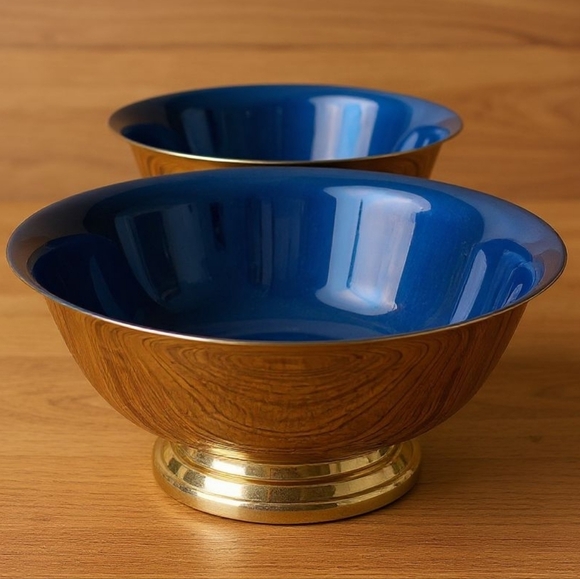 Elevate your home decor with this charming set of four matching **Wallace #9106** decorative bowls! These pieces are part of Wallace's renowned "Color-Clad" line, known for its elegant combination of materials. Each bowl features a stunning and smooth **sterling silver-plated exterior** that beautifully contrasts with a vibrant, reflective **blue coated interior**. These eye-catching bowls are finished with an elegant pedestal base, adding a touch of sophistication to any space.