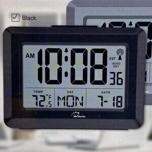 The WallarGe Atomic Clock is a modern and sleek rectangular digital clock designed for adults. It is battery powered and features a special temperature display and alarm function. With dimensions of 8.5 inches in height and 7 inches in width, this black clock is perfect for indoor use and accurately displays the time and temperature. Its stylish design and practical features make it a convenient addition to any kitchen or living space.