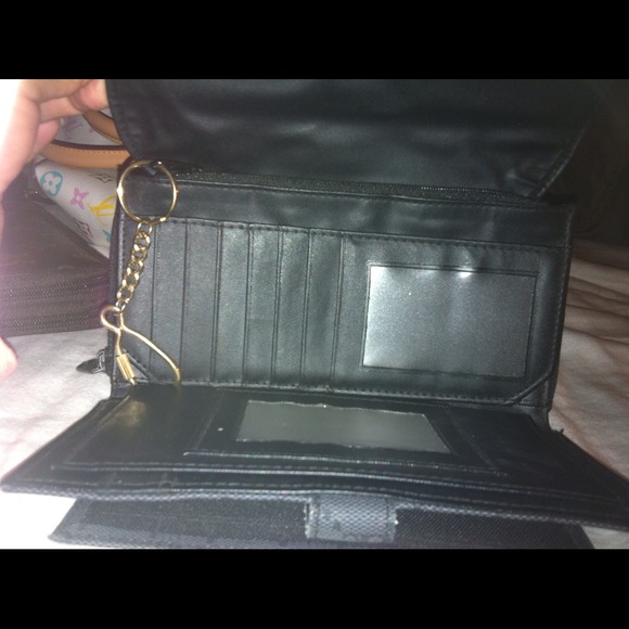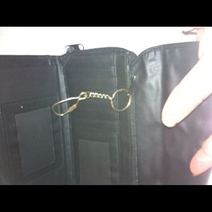 Large black wallet has lots of room,can fit a check book and a pen holder,credit cards,pictures,a mirror and has a key ring on the wallet