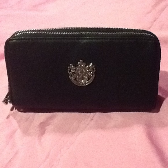 Black, two compartment wallet with simple crest embellishment. Room for credit cards, cash, and change compartment.