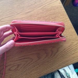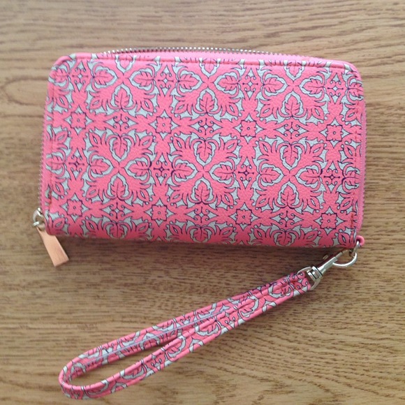 Cute coral wallet with cream pattern. Comes with a wristlet so it is very functional! Barely used. One hardly noticeable stain