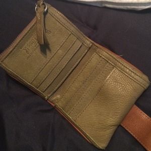 Older Fossil design. 6 pockets for cards and ID. One small zipper outside for coins and bigger opening inside for cash.