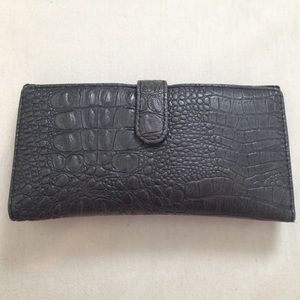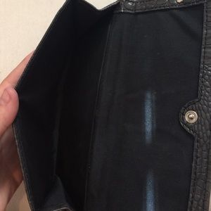 Black snake wallet. Clean and lots of pockets for money/cards. Separate compartment for cash and then once opened another 2 pockets for cash. Card holder as well as license holder
