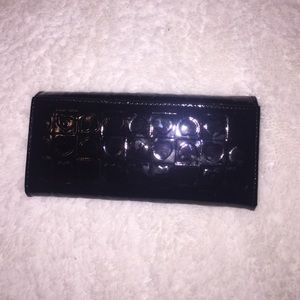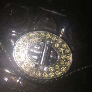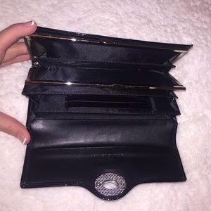 This black wallet is accented with little rhinestones around the clasp. It has several folds including a place for cards, change, and cash.