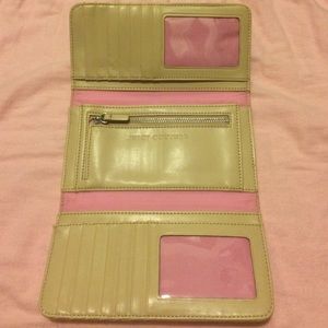 Cream wallet with snap closure, 1 exterior slip pocket, 6 interior slip pockets, 1 zip pocket in the interior, and 14 credit card slots.