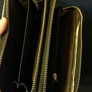 Wide wallet, with 2 compartments, a strap to carry like a clutch, even holds some smart phones.