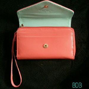 Brand new super cute wallet in watermelon red with baby blue on the inside has a spot for your phone with a slit for headphones.