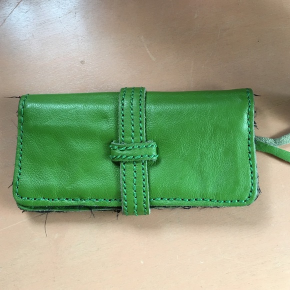 Soft green leather with stitching detail. Many pockets and compartments in great shape never used. Handmade in Costa Rica