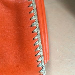 Orange soft leather wallet. Handmade in Costa Rica. Beige stitching. Many compartments snap closure. One or two spots on exterior.