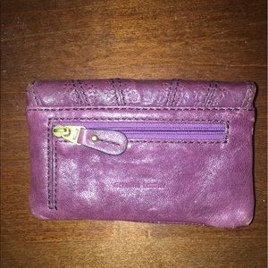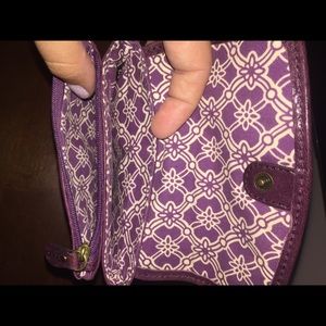 Purple leather Fossil wallet. Coin pouch on the back side. Button that clasps it shut. Purple and white pattern on the inside, with another zipper pouch.