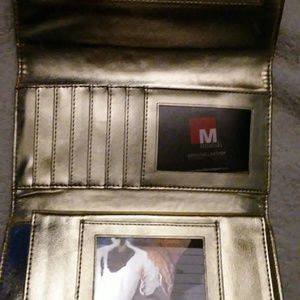 Mundi checkbook wallet. Metallic gold in color. Small zipper pocket under front flap, 6 credit card slots. Slip pocket behind checkbook section and behind credit card slots. Exterior zipper compartment on the back of the wallet.