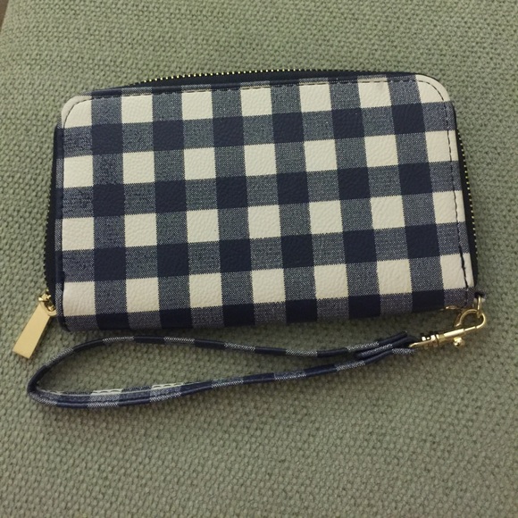 Navy and white plaid clutch