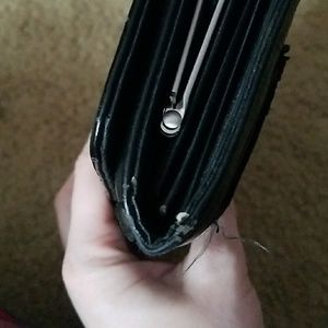 This wallet has lots of space for money, cards, and change. Has a little wear on the sides as shown in pictures but not very noticeable.