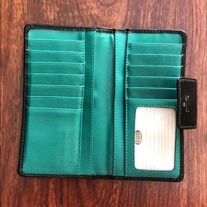 Leather wallet with 16 spaces for cards, dollar bills and pocket for coins.