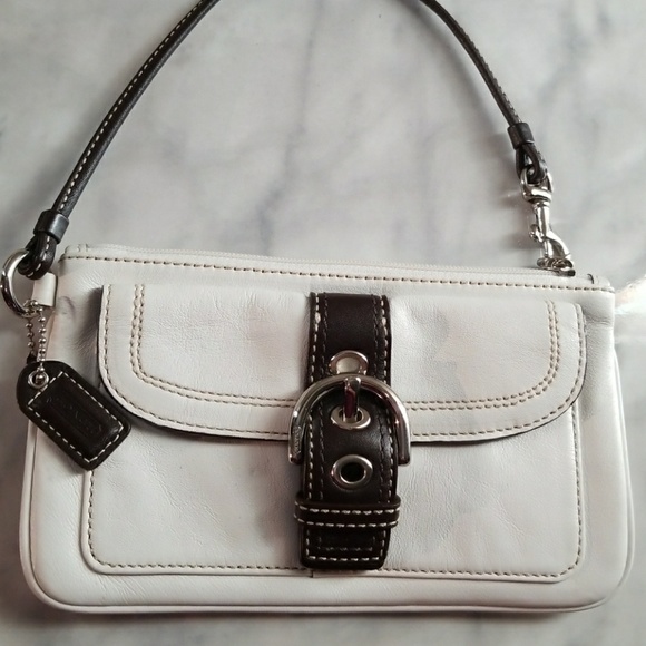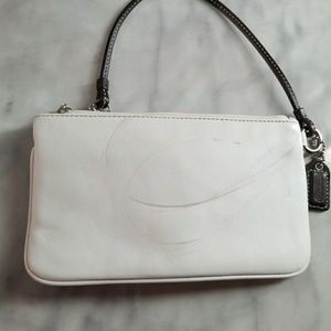 White wristlet by coach. Needs some cleaning with leather cleaner from the brown strap. Other then that its in perfect condition