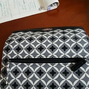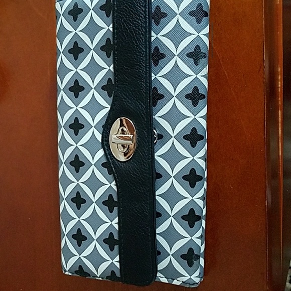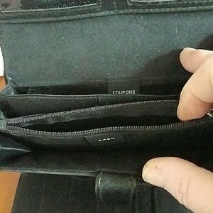 EUC, wallet with ample space for checkbook, 2 plastic license pockets, it also has labeled Cash, Receipts, and Coupons. Cash pocket has a zipper closure. Back has a small pocket with zipper closure.