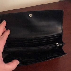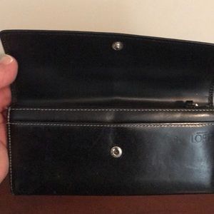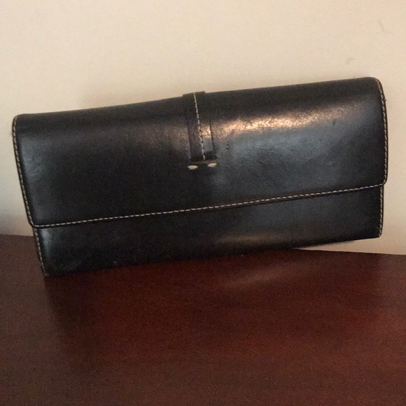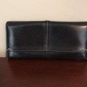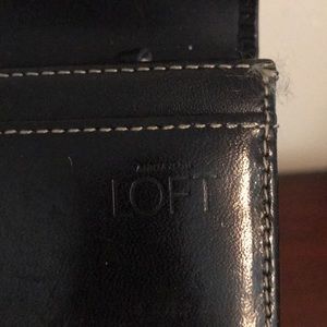 Black leather Ann Taylor Loft wallet with top stitching. Snap closure, zipper compartment. 16 cc slots. Good to fair condition.