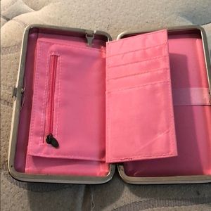 Has slots for all cards and a zipper with an extra slot for cash. You could have cell phone inside as well depending on how much you need in this wallet.