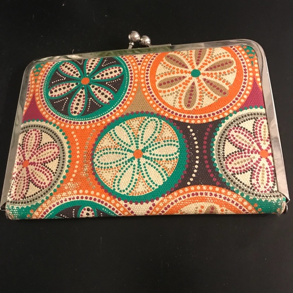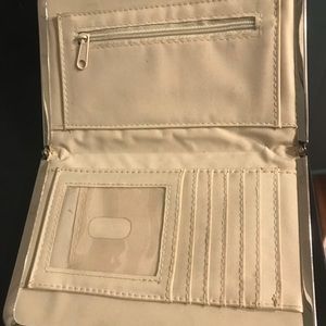 - flat wallet - two ball clasp - flowered leather like pattern - card holder - change pocket - two side pockets - silver trim