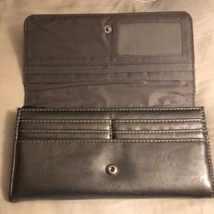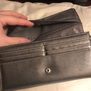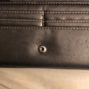 Charcoal grey button snap wallet. Very cute and stylish with gems and round studs to border the outside edges. This wallet has one outside pocket, 3 inside pockets, a zipper pocket for change and TONS are storage for all of your important cards. Great condition.