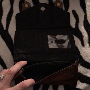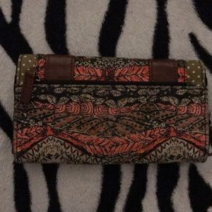 6 card slots, 4 pockets, zipper pouch inside and on the back.