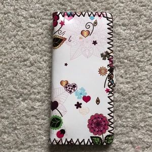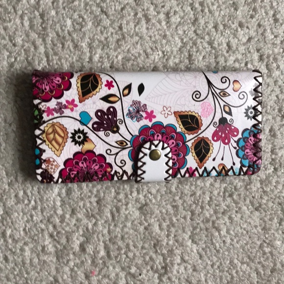Based on the front flap in the first picture the length is 7.5 inches and the width is 3.5 inches. Made of leather. Brand new and unused but no tags attached