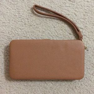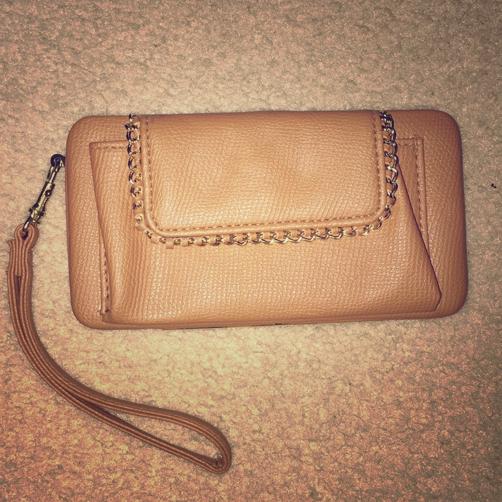 Tan brown wallet with gold detailing. Change pocket and six card holders. Two cash pockets