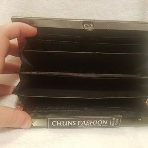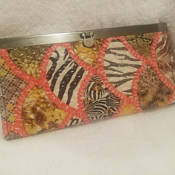 Coral colored seashell patterned, bubbly textured 5 pocket wallet with card slots.