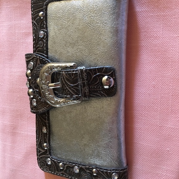 Silver wallet with brown western detail. Change purse on the back. Place for checkbook inside. Not leather.