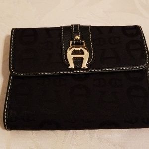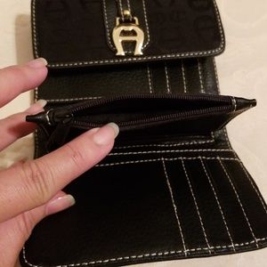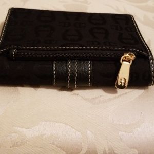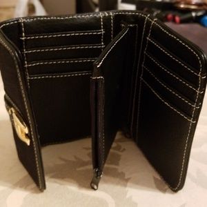 Never been used Signature Leather interior and fabric exterior wallet. Lots of compartments. Snap closure. Zipper coin slot. Another zipper closure compartment. 8 card slots. ID window. Another 3 open compartments for bills and receipts. And another zipper pull pocket outside (back) .