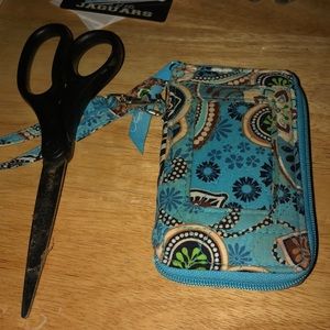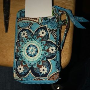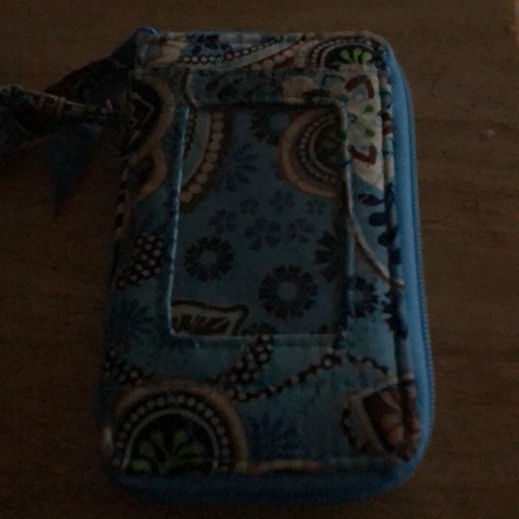 Wallet with clear view pocket in front and card spacers inside. Has a strap.