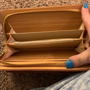 Brown zip around wallet. Wide inside with credi card slots, and divided into two areas. In middle is a zipper for coins. On the back is a cell phone case attached which snaps.