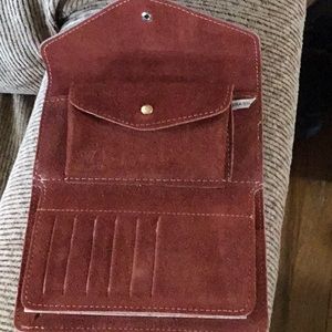 Sueded wallet made in Brazil of buckskin. Outside flap opens to inside coin holder, 6 card slots, and checkbook area. Rusty brown color. Like new.