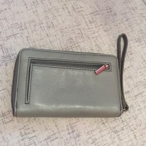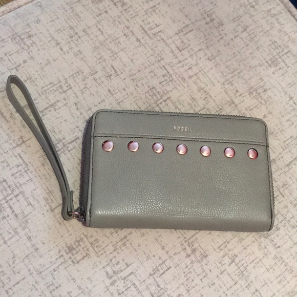 Pretty Fossil wristlet in grey with rose colored metal. Used for about a month, in great condition. iPhone 7 fits inside without a case.
