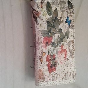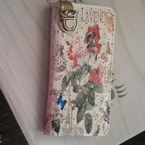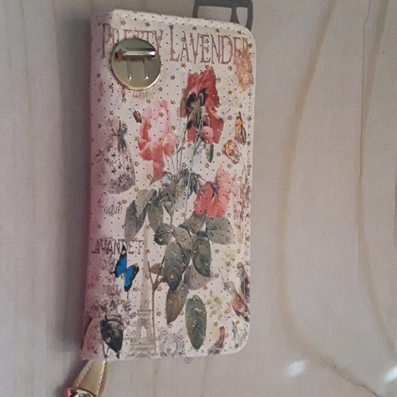 Flowery, wallet,with buckle to close,nice and roomy,holds 6 cards,plus change space, and other sections for money, and papers.also gold sparkly stars.