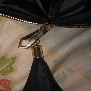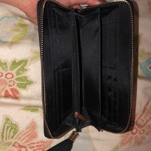 Black leather wallet with gold detailing. Slight wear on zipper pull but not damaged. Only used a couple of times