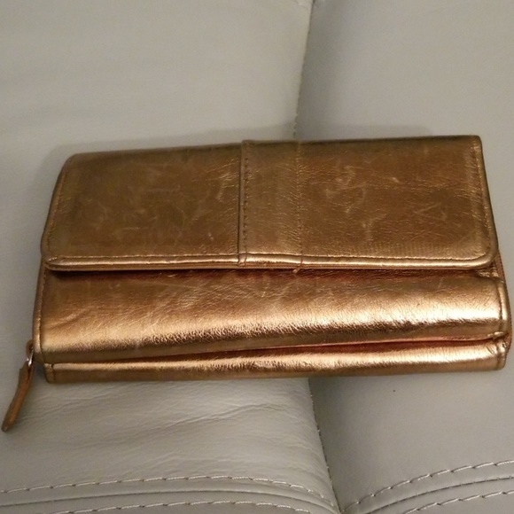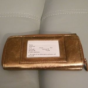 Bronze gold wallet with outside zippered pocket. Inside snap pocket. Billfold slot. Credit card slots. I'd card holder on the back. 3 inches tall and 6 inches wide