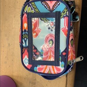 Never used 4 card slot and zipper on other side. Outside back for any card and front flap for phone maybe