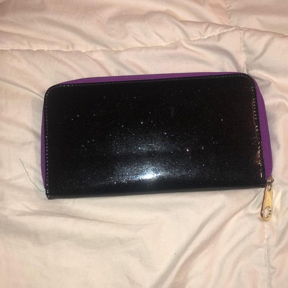Black and purple wallet with golden zipper. Room inside for many cards