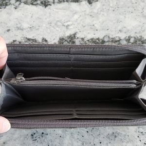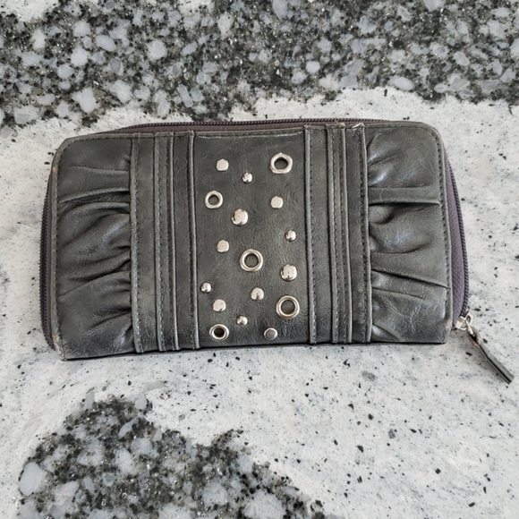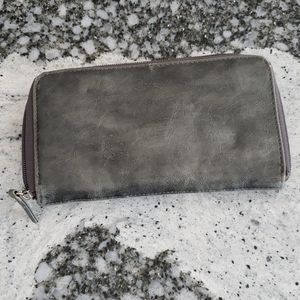 Silver colored zipper wallet.