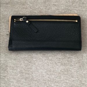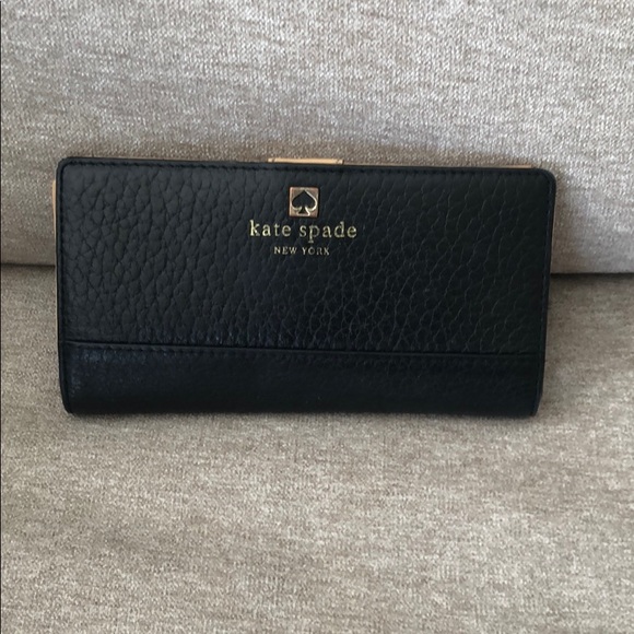 Black Kate Spade Leather Wallet- a little wear and tear on interior with a tear where ID would go and some scratches on front leather- great thin wallet with lots of storage space.