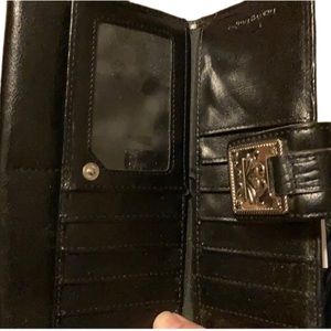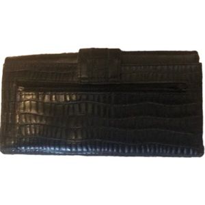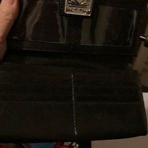 Wallet with snap closure. Zippered pockets on inside and back of wallet. Room for cards