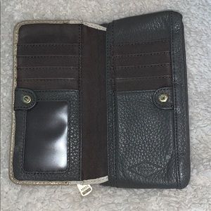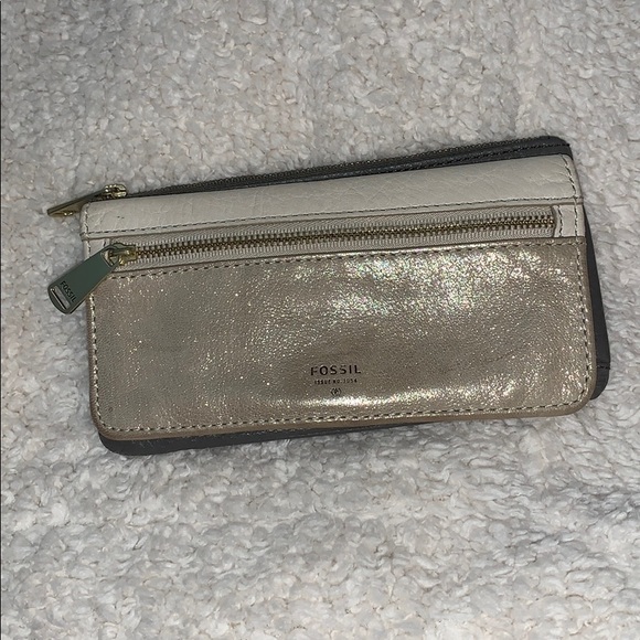 Gold sparkly wallet with grey leather. Coin pocket and snap shut with 10 spaces for cards and clear license plate cover. Fossil brand, all leather, stylish and chic.